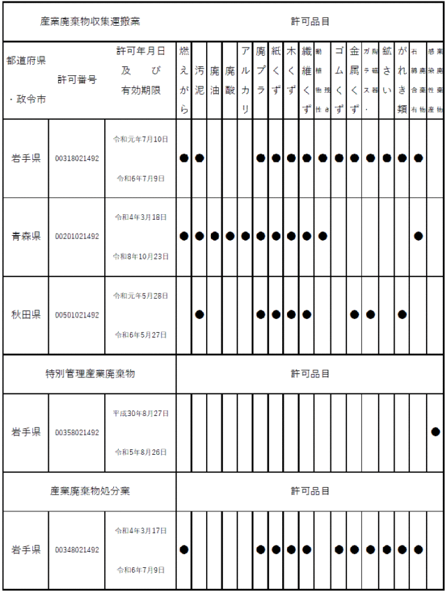 岩手県の収集運搬業、処分業の許可証に関しましては届き次第更新します。